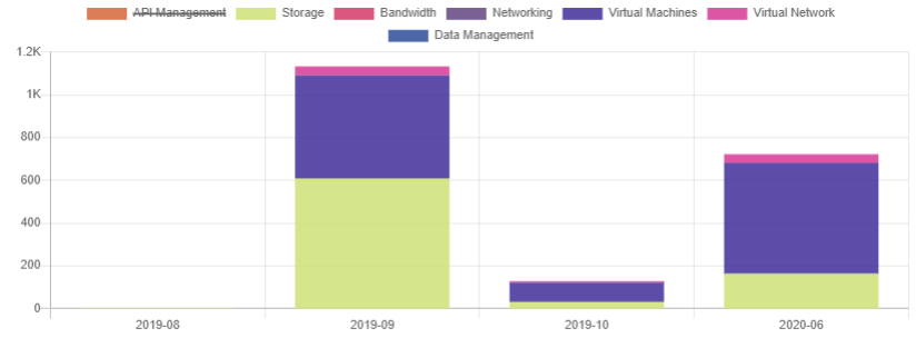 For example, an account has two subscriptions: for the Microsoft Azure service, the billing day = 1, and for the Microsoft 365 service, the billing day = 5. In this case, the displayed data for the 6 billing periods includes the following different periods: for the Microsoft Azure service — 01.01.2020 – 30.06.2020, and for the Microsoft 365 — 05.01.2020 – 04.07.2020.