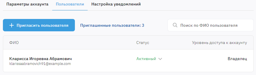 - Перейдите на вкладку Пользователи. Отобразится список пользователей, связанных с выбранным аккаунтом (см. Пользователи аккаунта).