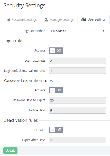 In the Login unlock interval, minutes field, enter a period in minutes when a new attempt of logging in will be available.
