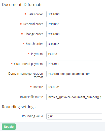Document ID format — a format of templates that are used for creating numbers of documents in the ActivePlatform. A document number must include the %N mask, where N - is a number of characters (minimum 6), and can include letters (for example, SO — Sales Order, RO — Renewal Order), dashes and placeholders.
