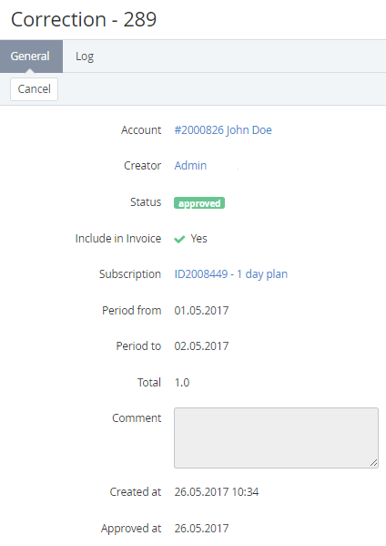 - - a link to the Subscription's details page, which was selected during the correction creation;