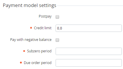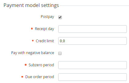 The Payment model settings group allows to choose the Payment Model: Postpay or Prepay, which is used Accounts that were included in the Account Class.