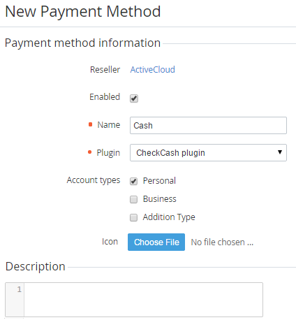 - In the Description field, enter information about the Payment Method that will be displayed on the Customer Control Panel. You can use the HTML, CSS, JS and Placeholders if is necessary.