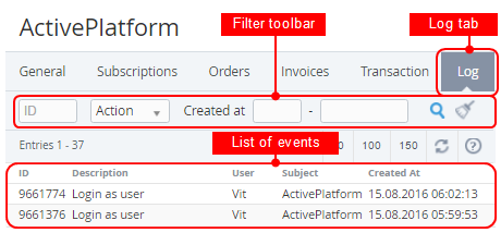 - On the account details page select the Log tab. On the figure below you may see an example of account's event log.