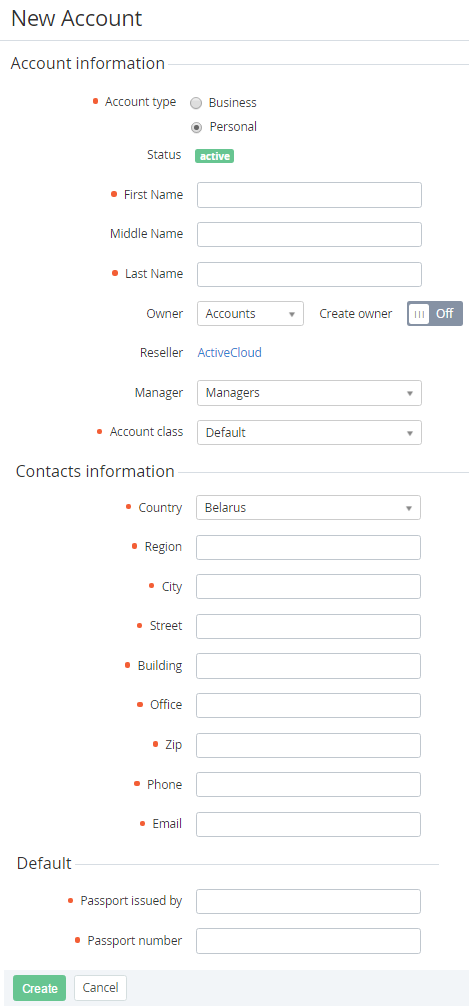 Each created Account must be attached to at least one User. This User will have the Owner access level in the Customer Control Panel. The Owner can be automatically created when you are creating an Account or the Owner can be created in advance (see. Creating a User).