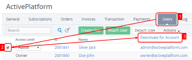 You can use user deactivation for required Account to terminate the access to the Customer Control Panel. Deactivation or activation is possible if the Global status of the User is Active (see Global Deactivating a User).