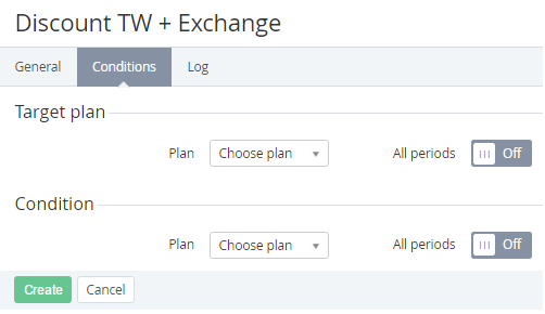 - In the Condition group select the Plan and Plan Period, which a Customer must order to get the Discount for the Plan that was selected in Target Plan group.