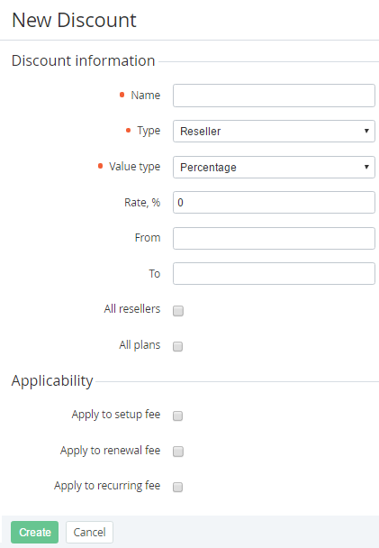 - Set the Apply to setup fee checkbox if you want to apply the Discount to the setup fee of the Plan.