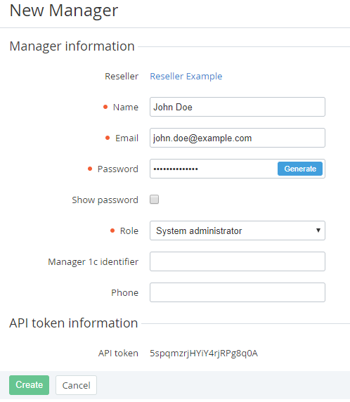 The Reseller's Manager is used to access the Operator (Reseller) Control Panel. To create a new Reseller's Manager: