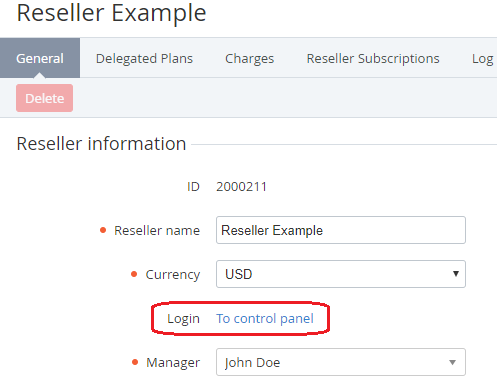 - In the General tab, click the To control panel link. You are logged in to the Reseller Control Panel of the selected Reseller.