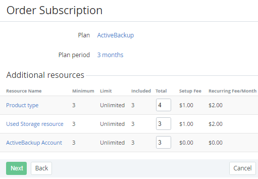 - Click Next. The list of subscription periods and costs are displayed to the selected Plan.