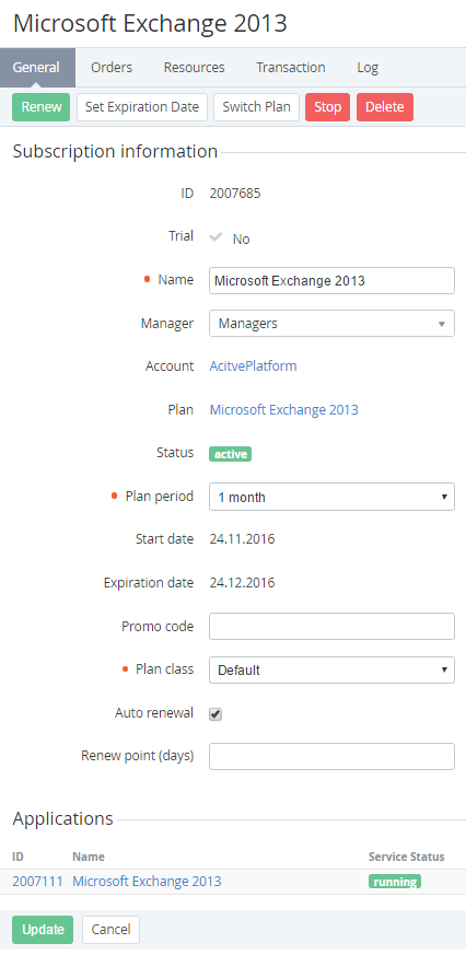 - Service Term — change a plan term, which defines the following subscription's parameters: Grace period and Stop period.