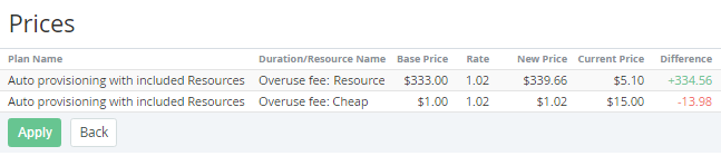 - Click Apply. The prices of the Plan Resources will be uploaded and updated for the Reseller.