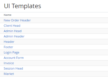 The UI Templates page displays the List of UI Templates which consists:- New Order Header - the template of the Header of the New Order page in the Customer Control Panel (see Ordering an Application for registered Users in the ActivePlatform. Customer Control Panel);