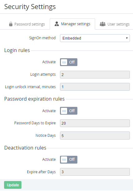 In the Expire after Days field, enter a number of days after the last manager login when the manager will be deactivated.