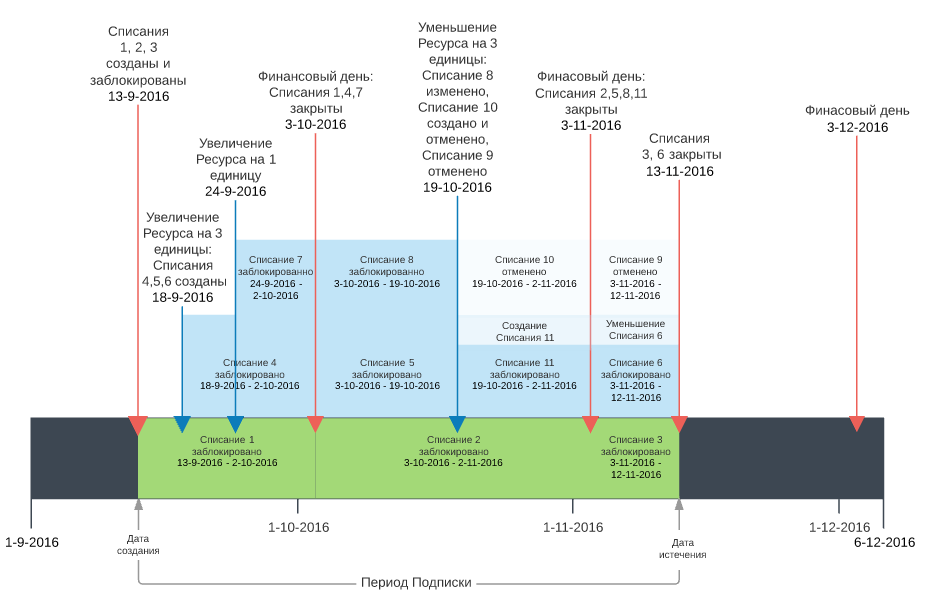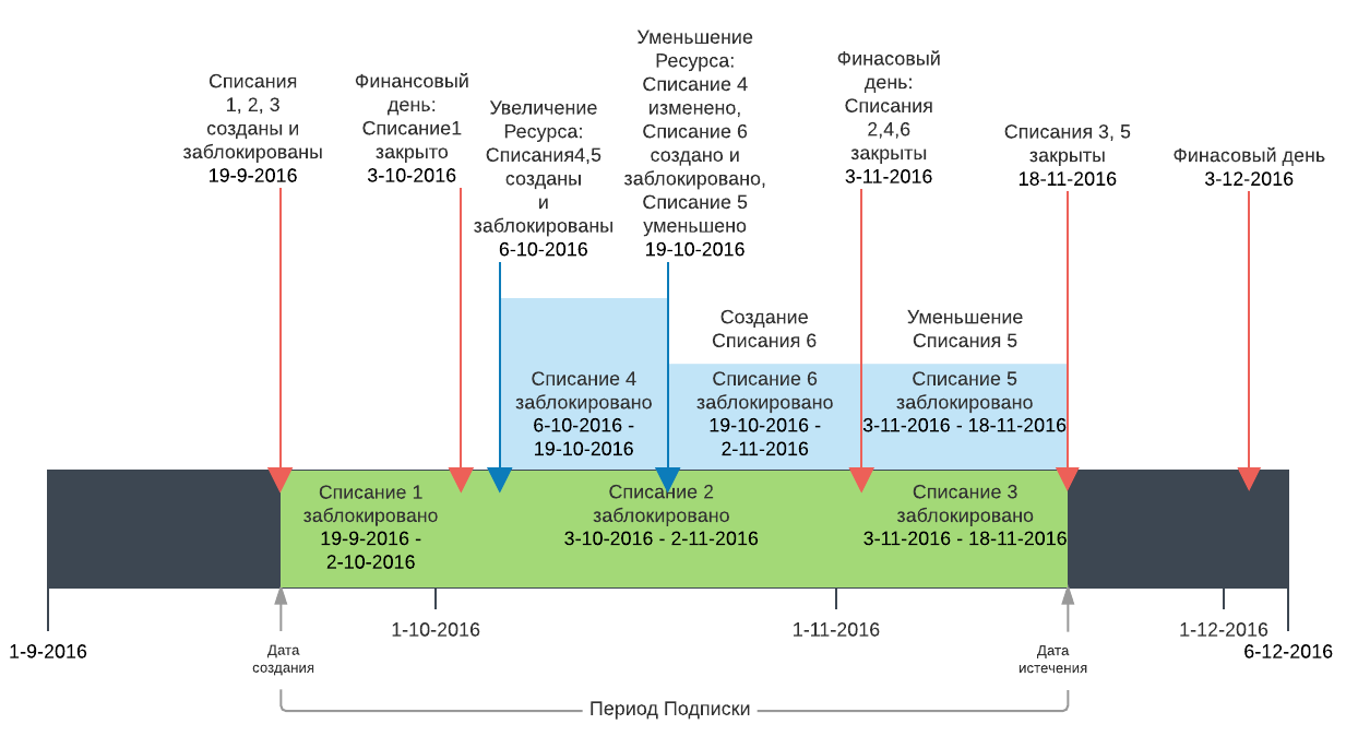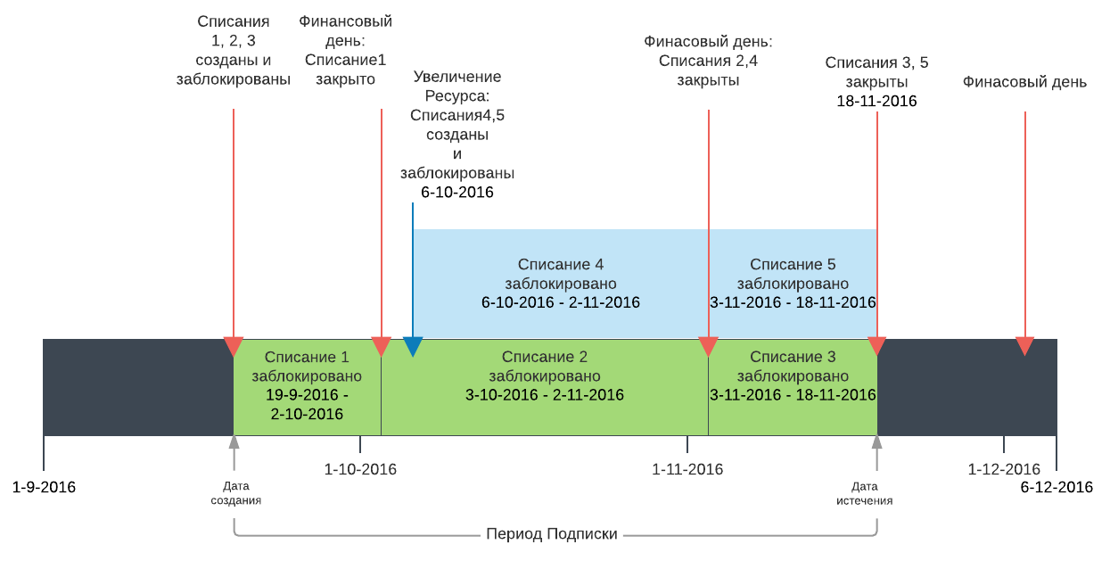 - Клиент производит заказ Дополнительного ресурса 6.10.2016. Полученные при оплате средства блокируются и создаются следующие Списания, исходя из оставшегося Периода подписки: