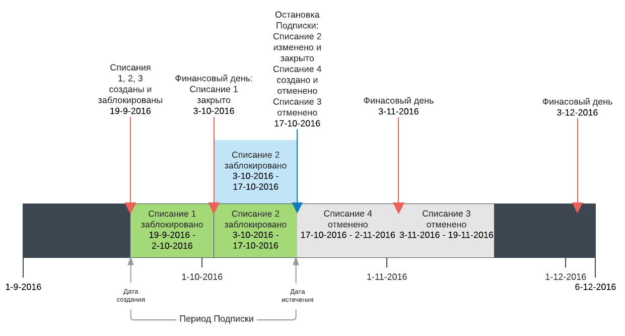 - Списание 5: период от Финансового дня до Даты истечения подписки (3.10.2016 - 2.11.2016);