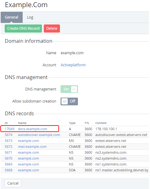 - In the DNS records group, click the ID or Name link for the required record.