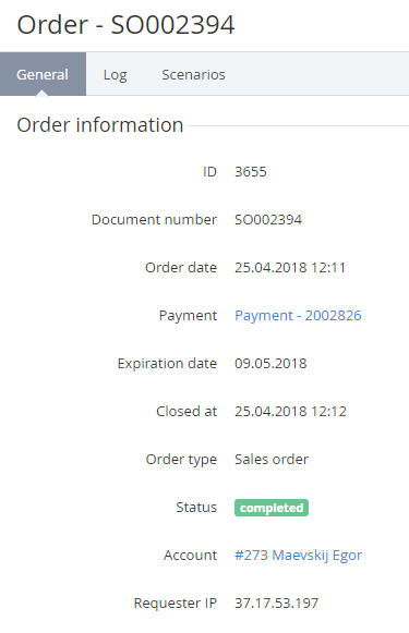 - Scenarios — a list of operations that were performed to complete the Order (for more information see Automatic Operations that use Scenarios).