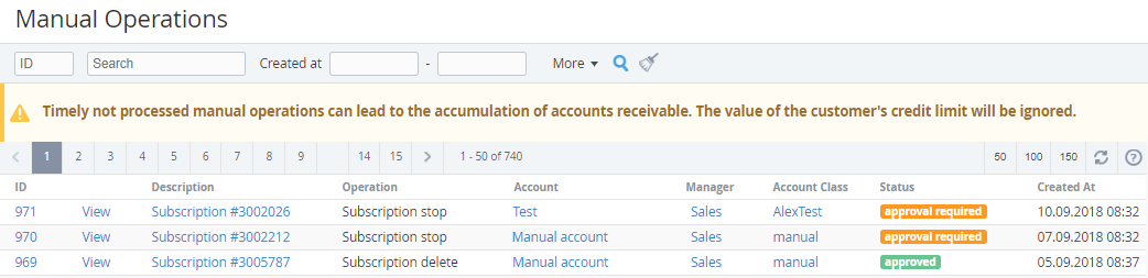 - View link — a link to the Manual operation page (see Managing Manual Operations);