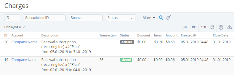 • Taxes - taxes amount for the Charge. Manager can add taxes only for Accounts that use the Postpay charging model (see Add taxes);