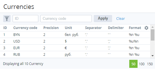 The list of currencies and their parameters are read-only. To add a new currency or make any changes in the existing currencies, please contact the support team.