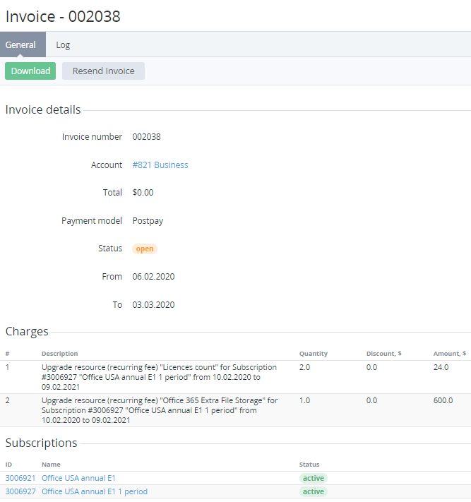 Viewing details of the Invoice for the Postpay charging model
