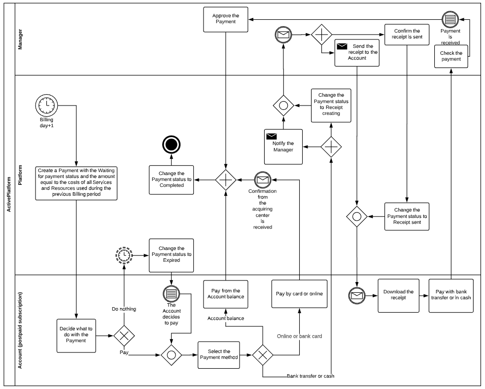 The following diagram represents the Payment for rendered Services life cycle. For information about the notation, see https://en.wikipedia.org/wiki/BPMN.