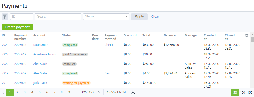 - Status — status of the Payment (see Payment types).