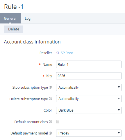 The Account Class's details page consists of the following tabs:- General — a general Account Class's information (see Creating an Account Class);