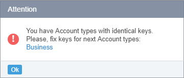 In that case, the Manager needs to change the keys of the Account Types listed in the message (see Viewing and updating Account Type's details).Default — the attribute is set to Yes if the Account Type is used by default for new Accounts in the Operator Control Panel and Customer Control Panel.