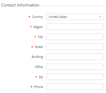 In the Contact information group, enter the address information of the Account which is needed to solve administrative, billing, and technical issues.