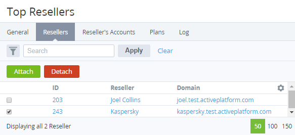 - Go to the Reseller tab. The list of attached Resellers is displayed (see Viewing the List of attached Resellers).