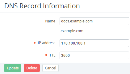 - Depending on the type selected DNS record, the DNS Record Information page displays a different set of the fields for entering the DNS-record settings. For example, for the A record you can update the following options in the DNS Record Information: