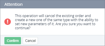 The confirmation window is displayed. - In the confirmation window, click Confirm. The existing Order and the related Payment will be cancelled. The page of a new Order of the same type is displayed to set new parameters.