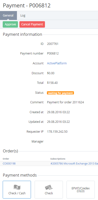 - Click the Approve button on the Toolbar. The Payment will be approved, and the Order will have the Completed status (see Viewing the List of Orders).