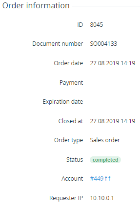 Expiration date — by this date, the Order must be paid (completed). The date is calculated using the value set in the Cancel unpaid order in field on the Account Class page (see Creating an Account Class).