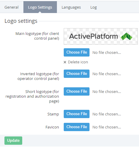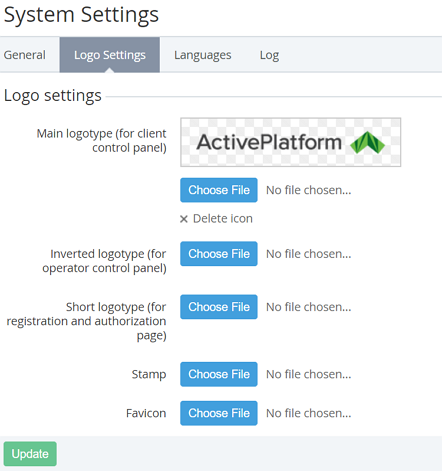 Click the Update button. Chosen logos are uploaded and displayed on the Logo Settings tab.
