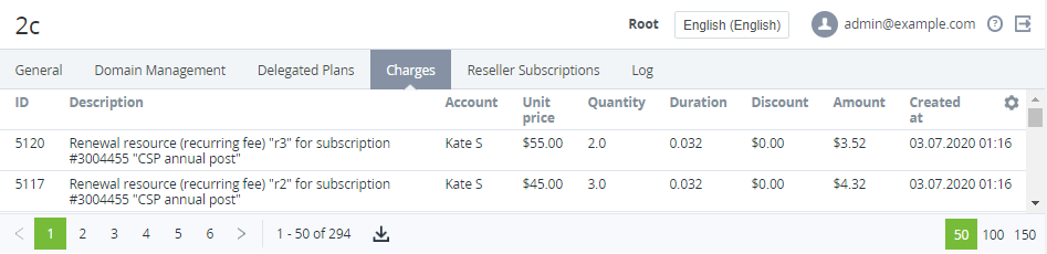 Reseller Charges are created when Account Charges for the Subscriptions to the delegated Plans get the Closed status (see Charges).