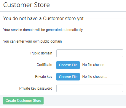 - Enter the existing public domain in the Public domain field. It is used by customers to access Customer Store.