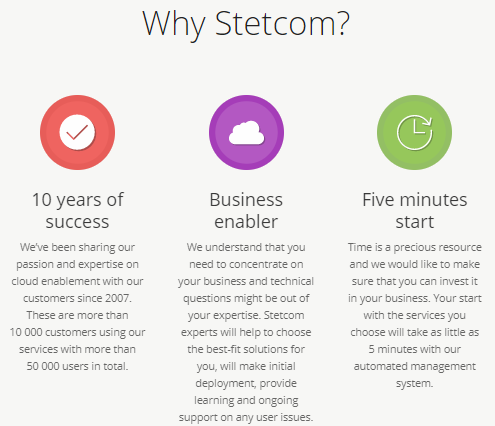 - Benefits —the section divided into three columns and containing examples of Reseller's competitive strengths. The section has the Why Stetcom? general heading. Each column contains an icon, a subheading and a short text describing a specific competitive strength. Subheadings serve as links to Information pages. Link addresses to be specified.