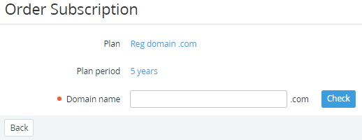 In the Domain name field, enter the name of the domain for registration and click Check. If the domain name is available for registration, the Next button will be displayed.