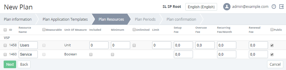- In the Included field, enter the amount of the Resource which will be included in the Plan by default. The Included Resources prices are included in the Subscription price.