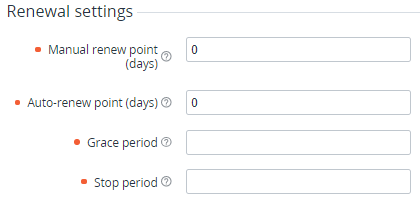 In the Auto-renew point (days) field, enter the number of days before the Subscriptionexpiration date when a Renew Order is automatically created for the Customer. This parameter can be redefined on the Subscription level.