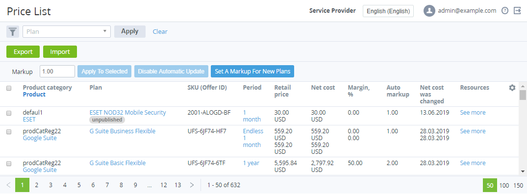 - Plan Periods fees (monthly) — recurring fee for the Plan period taking into account the automatic markup that is set at the level of the current Reseller.