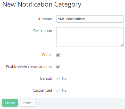 - Select the Public checkbox to make the notification category available for use in the Customer Control Panel (see Notification settings).