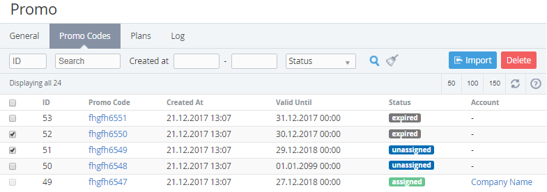 Only the promo codes with the expired and unassigned statuses can be deleted.