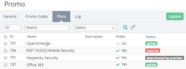 - inactive - the Plan was deactivated by Manager (see Deactivating a Plan and Activating a Plan). The Plan is not available for ordering.