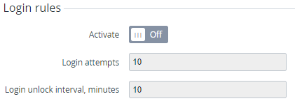 In the Login unlock interval, minutes field, enter the period in minutes when a new attempt of logging in will be available.
