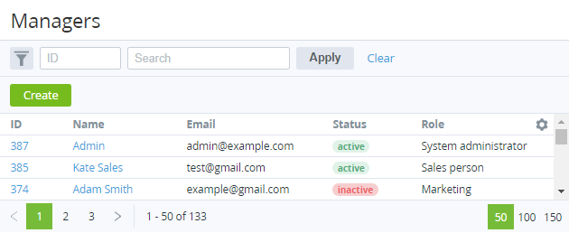 - Role — Manager's role: Salesperson, Marketing, Product owner, System administrator.
